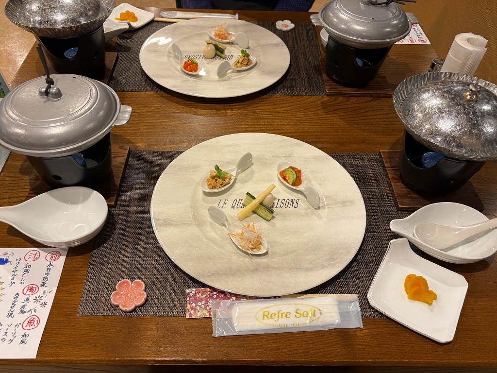 夕食開始時点。絶妙なタイミングで次々と料理が運ばれてきます。