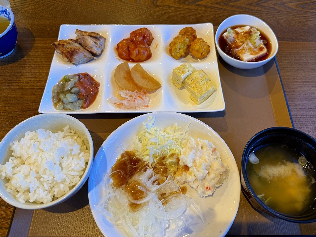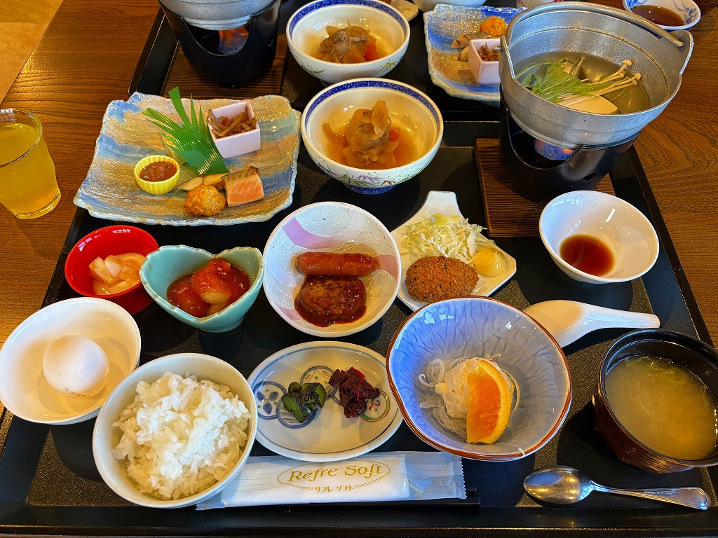 食事は、夕食が約8品の和洋創作膳、朝食は宿泊状況によりセットメニュー又はバイキング形式。美味しいのはもちろんですが、ご飯を控えめにしないと食べ切れません。
