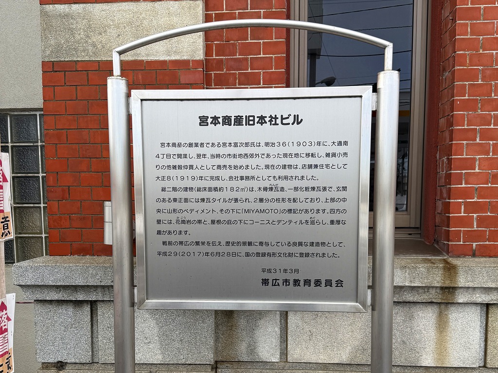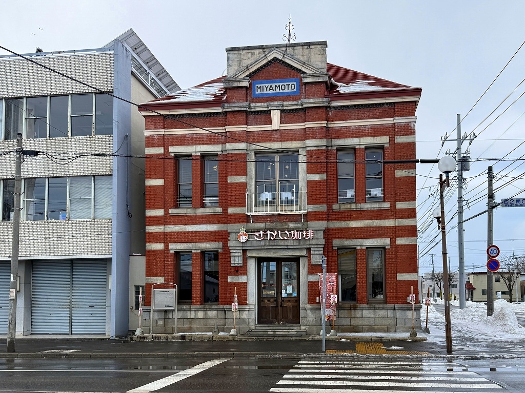JR帯広駅から徒歩約15分のところにある建物。宮本商産の創業者宮本富次郎氏は、開業翌年の1904年にここで雑貨小売りの他雑穀仲人として商売を始めました。建物は、店舗兼住宅として1919年に建てられた店舗兼住宅で、2017年には国の登録有形文化財に登録されています。現在は、「さかい珈琲帯広店」の店舗として活用されていますが、建物外壁の上方には、今も「MIYAMOTO」の標記が残っています。