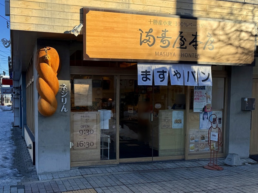 JR帯広駅から徒歩約6分のところにあるパン屋さん。1950年創業の老舗パン屋「ますや」の本店で、店舗入口に掲げられているモニュメント「ネジりん」が目印。経営者数代を経て2012年に達成した、十勝産小麦を100%使っているのが一番の特徴です。一番人気は「ネジリドーナツ」。ふわっともちもちした「ベビーパン」もおすすめ。