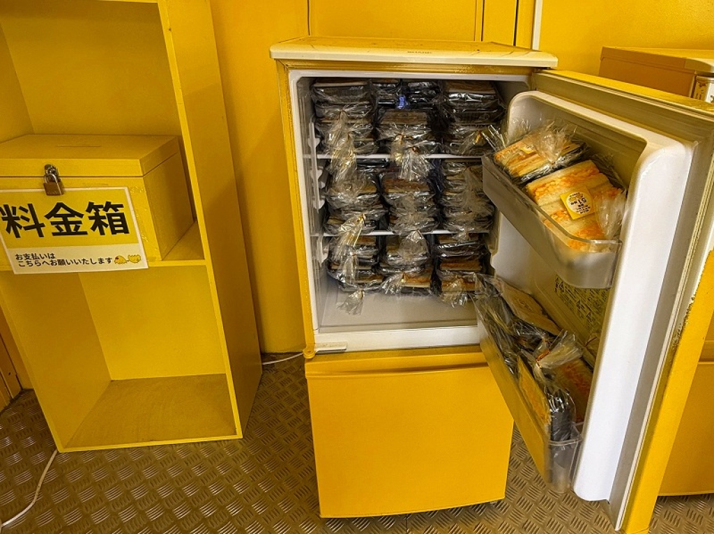 購入は、黄色い冷蔵庫を開けて、商品を中から取り出して料金箱に購入代金を入れるシステム。両替機も設置されていますが、小銭切れだった時に備えて100円玉を持参した方が良いでしょう。