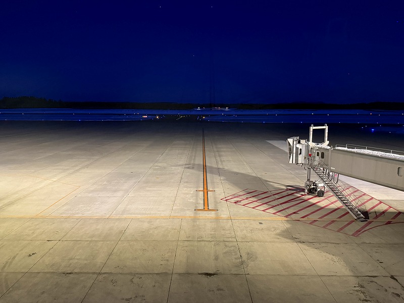 帯広空港ターミナル3階にある展望デッキ。展望デッキは屋内にあるので、冬も寒さに震えることなく、滑走路を飛び立つ飛行機を眺めることができます。室内を明るくすると、夜間、窓ガラスの反射で外が見えづらくなるため、照明の照度が下げられています。
