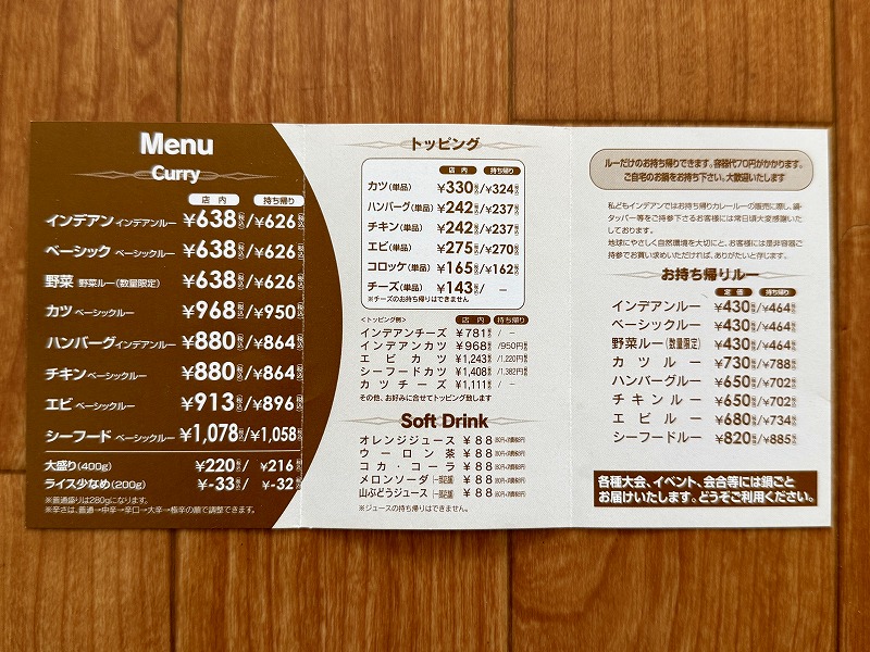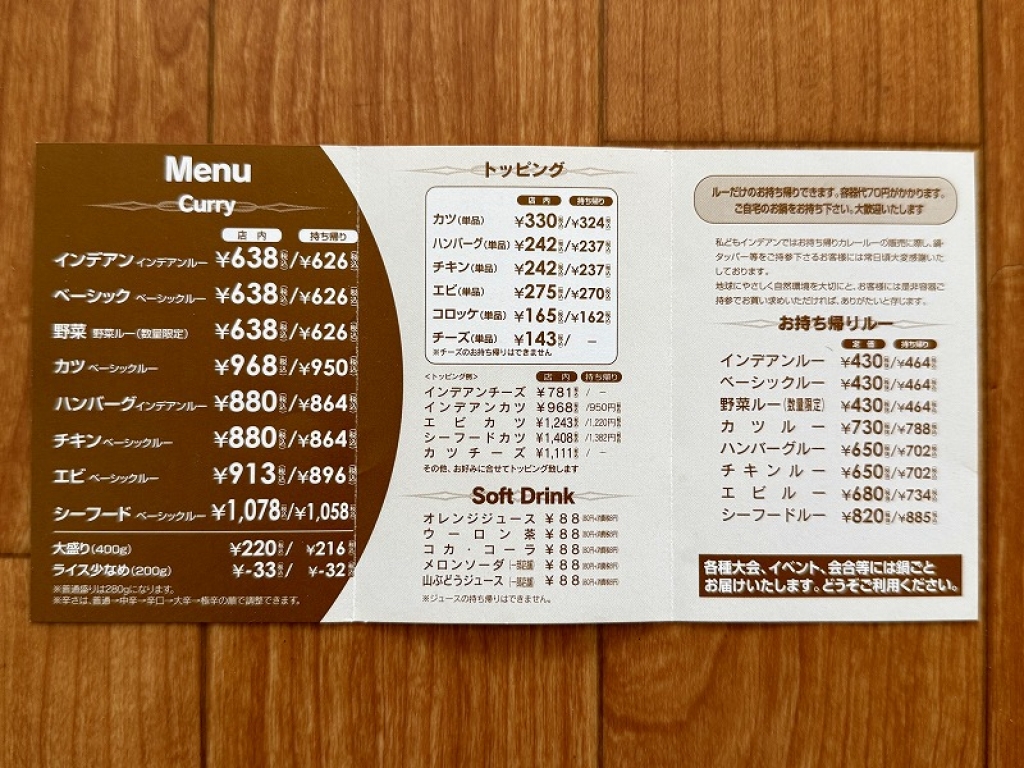 インデアンルー、ベーシックルー、野菜ルーの3種類。辛さは5段階から、追加有料トッピングが5つあります。おすすめはインデアンルー。