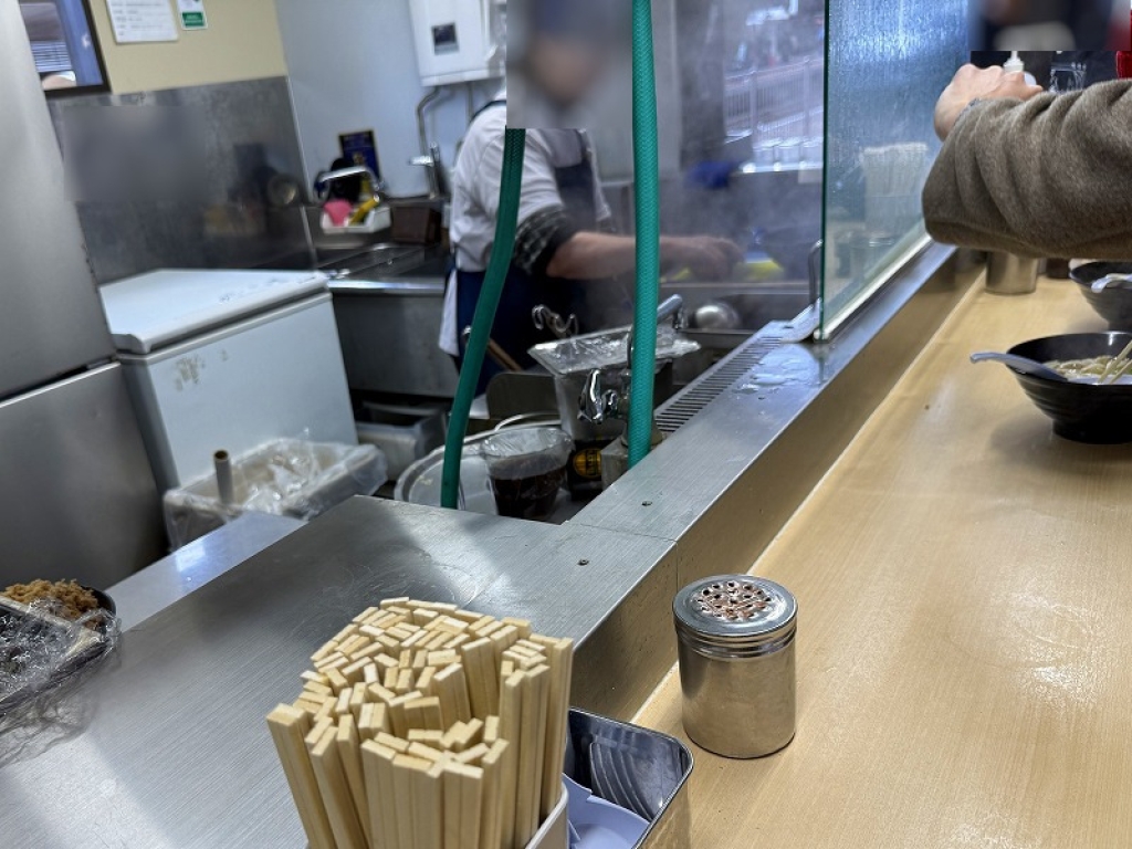 レンゲと箸、七味はセルフで。